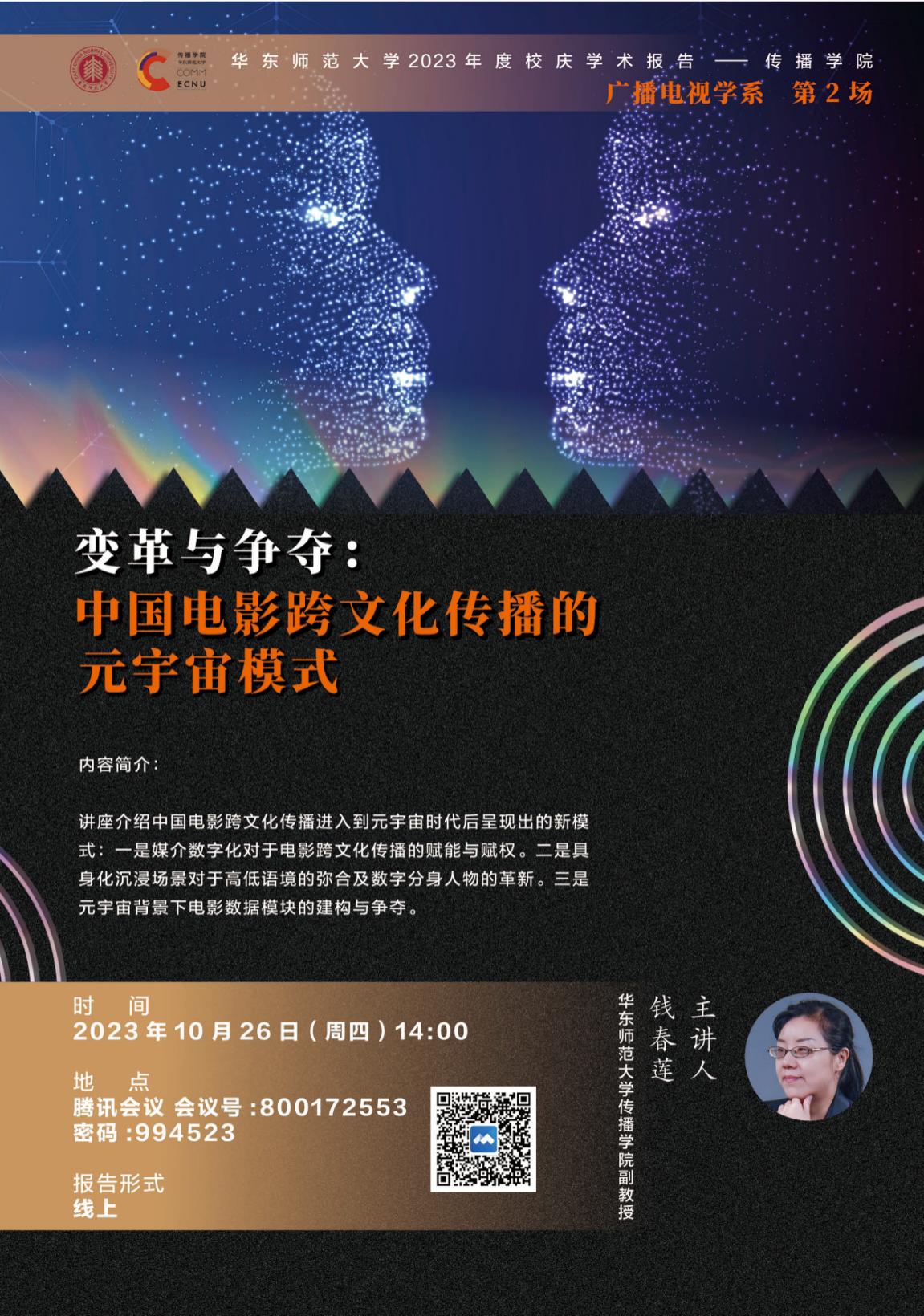 讲座介绍中国电影跨文化传播进入到元宇宙时代后呈现出的新模式:一是媒介数字化对于电影跨文化传播的赋能与赋权。二是具身化沉浸场景对于高低语境的弥合及数字分身人物的革新。三是元宇宙背景下电影数据模块的建构与争夺。