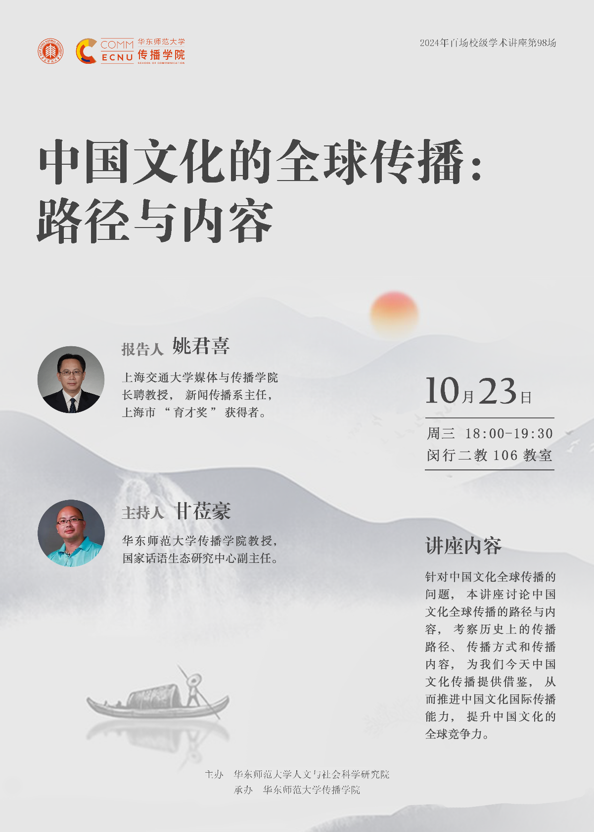 如何在全球视野中考察中国文化?历史上的中外文化交流中,中国与世界建立了怎 样的互构关系?全球化背景下如何认识中国文化?当今互联网等新媒体的发展,如 何推动中国文化的国际传播?针对中国文化全球传播的问题,本讲座讨论中国文化 全球传播的路径与内容,考察历史上的传播路径、传播方式和传播内容,为我们今 天中国文化传播提供借鉴,从而推进中国文化国际传播能力,提升中国文化的全球 竞争力。