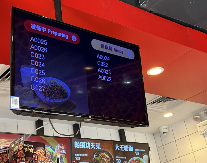 永和大王店面里悬挂着叫号屏幕,在店内点餐后拿到的点单号以A开头,使用套餐的点单号则以C开头。记者观察到,A、C开头的订单数大致持平,使用线上团购的顾客不在少数。