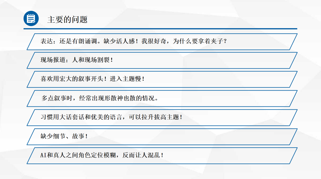 随后,臧熹用“顺、动、细、融”四个关键字精炼概括了新闻报道中"现场感"的核心要素:“顺”不仅意味着语言表达的逻辑清晰,还包括视频中空间调度的顺畅;“动”则强调画面的动态效果,报道需要紧跟现场实时发生的变化。镜头的运作、人物的行动以及场景的转换,都能够增加画面的信息量和表现力;“细”是指报道中细节的重要性,每一条新闻都需要充分的细节来支撑;“融”则强调未来的报道应更好地融合数字化手段,特别是AI技术,如数据图、动画以及虚拟场景的结合,可以让报道更加直观。