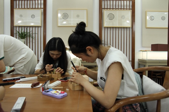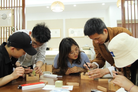 进入实践环节,党员同志们兴致高昂,纷纷拿起刻刀和印石,并根据党纪条例关键词“明纪、守纪、知纪、学纪、知敬畏、存戒惧、守底线”开始篆刻创作。在美术学院书法篆刻专业党员蔡峥同志、吕明姝同志、朱丁丁同志、李沐阳同志的悉心指导下,大家逐渐掌握篆刻的基本技巧,以刀为笔,书写心中对党纪党规的理解。