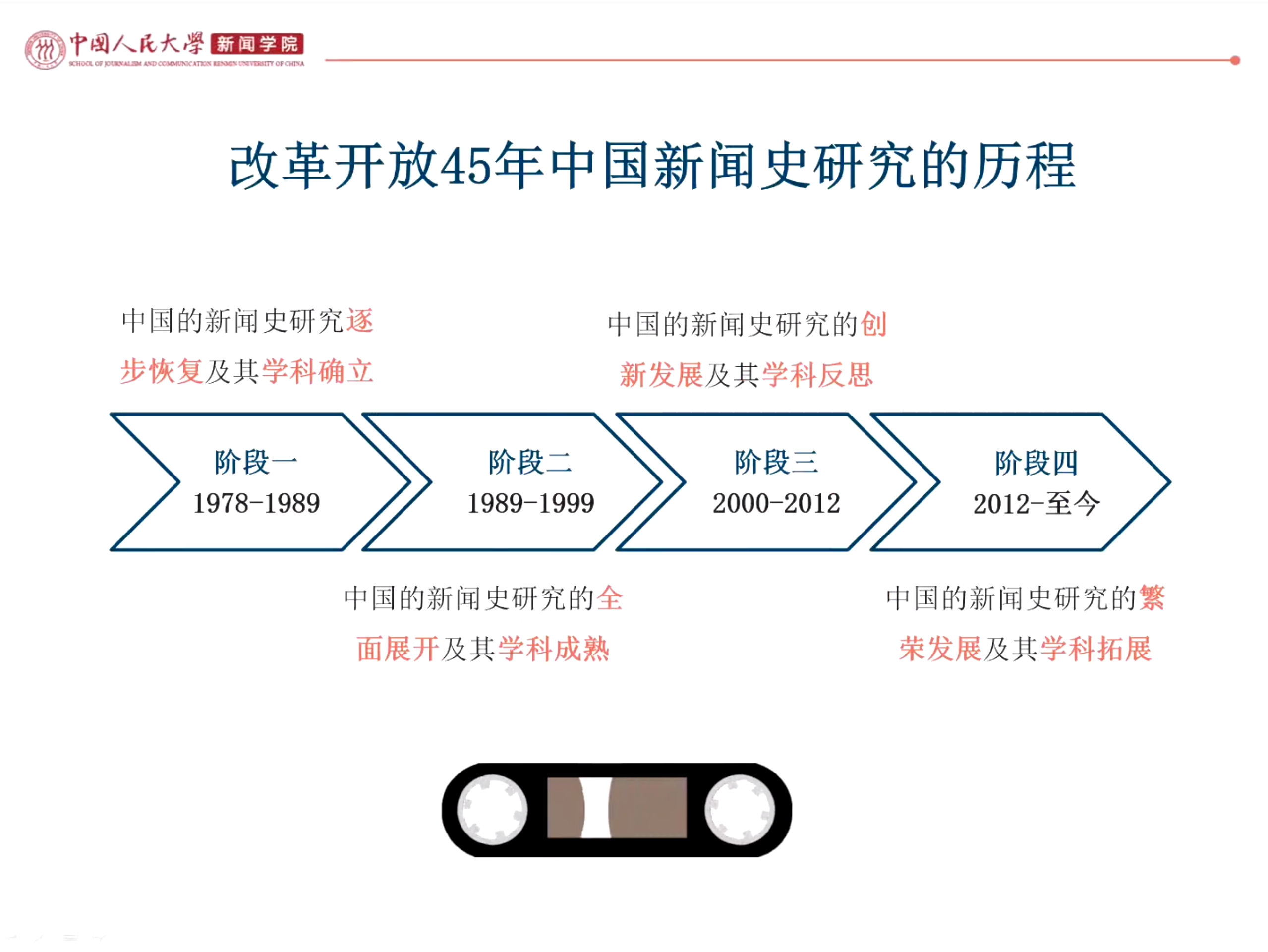 随后邓绍根详细介绍了改革开放45年来,中国新闻史研究发展的四个阶段:1978年至1989年,中国新闻史研究逐步恢复,学科得以确立;1989年至1999年,中国新闻史研究全面展开,学科走向成熟;2000年至2012年,中国新闻史研究迎来了创新发展和本学科反思;2012年至今,中国新闻史研究走向繁荣,学科不断拓展。经此梳理,一条中国新闻史研究的发展脉络展现在大家眼前。