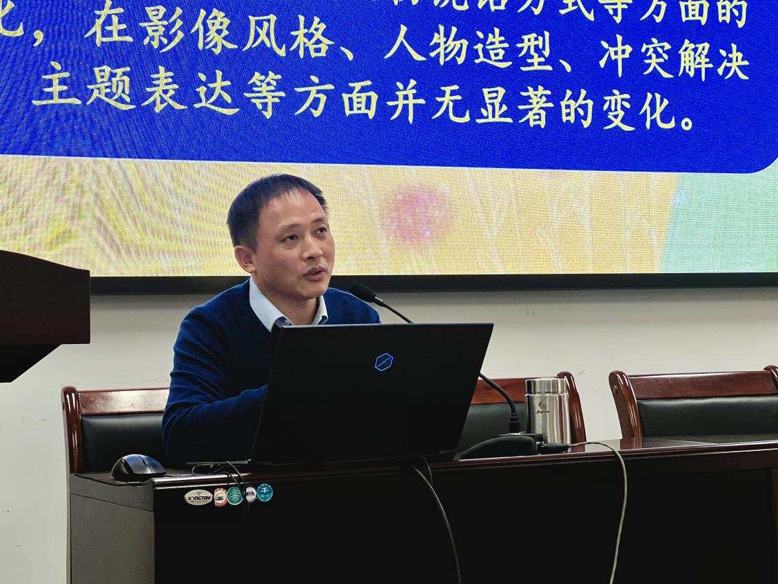 讲座伊始,龚金平教授从“国潮”与“新国潮”的概念出发,阐释“中国风”的时尚化、新潮化在内容与形式上融合了技术与艺术、二次元与三次元,在科技内核与现代内涵上努力以中国独创引领世界潮流。在新国潮的背景下,中国动画电影亦经历了相应的演变,体现在人物造型、空间环境、题材选择、音乐搭配以及影像风格等多个方面。龚教授结合近些年来的知名动画影片《哪吒之魔童降世》、《雄狮少年》、《封神演义》等,用详实的案例深入浅出地讨论了“新国潮”背景下“国漫”的内容标签,从命运悲剧到性格悲剧,导演们努力在主题、情节内容、人物设置中追求与“当下”的对话,以“中国创造”作为“新国潮”的旗帜,融入对“青春”“个性”的独特书写。