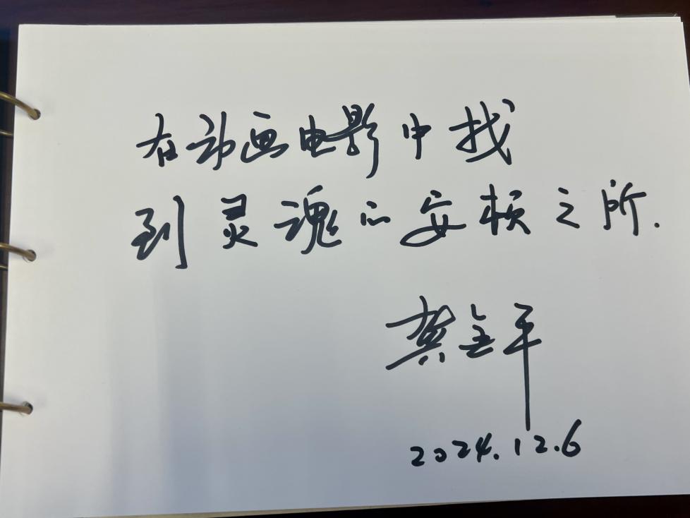 此次讲座为同学们深入理解中国动画电影在新国潮背景下的发展提供了丰富视角和深刻见解。讲座结束后,龚教授欣然为啪啪啦 广播电视学系留下寄语:“在动画电影中找到灵魂的安顿之处。”