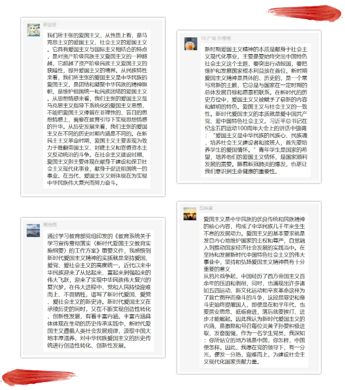 首先,各位党员在凌玉菁的带领下,在微信群内认真学习了《教育系统关于学习宣传贯彻〈新时代爱国主义教育实施纲要〉的工作方案》等教育领域重要文件,围绕扎扎实实地履行好师大人的育人使命、文明使命和发展使命,按照微信群成员顺序分享交流了关于新时代爱国主义精神的实质和丰富内涵的心得体会。