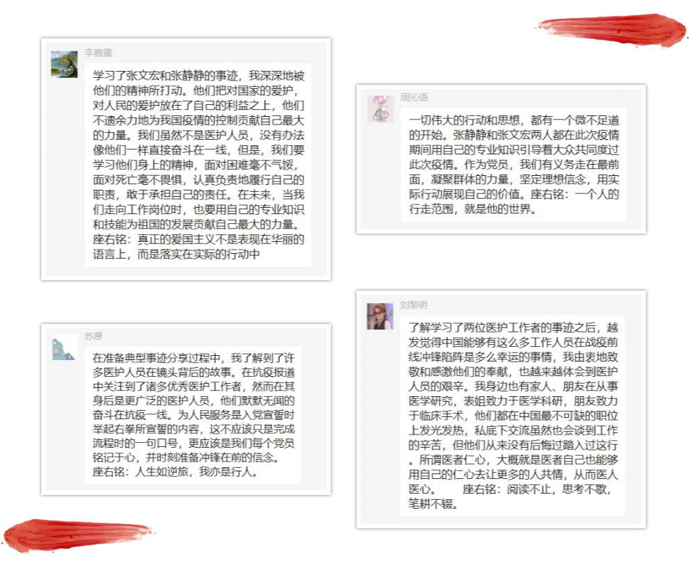 在学习了张文宏和张静静的事例后,各位党员也结合自身情况分别发表了学习心得,并为自己写下一句话的座右铭。