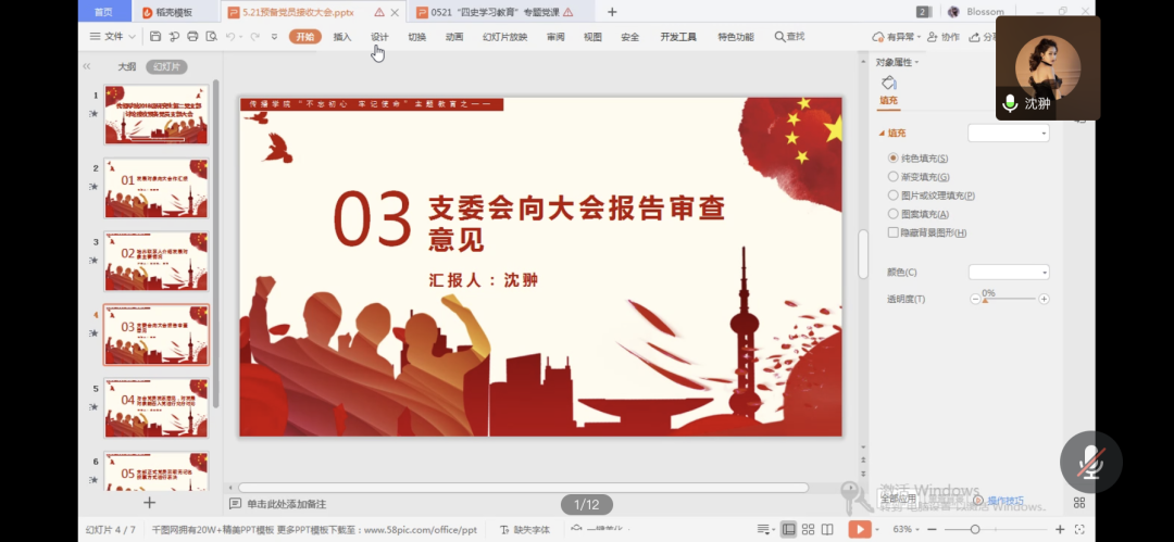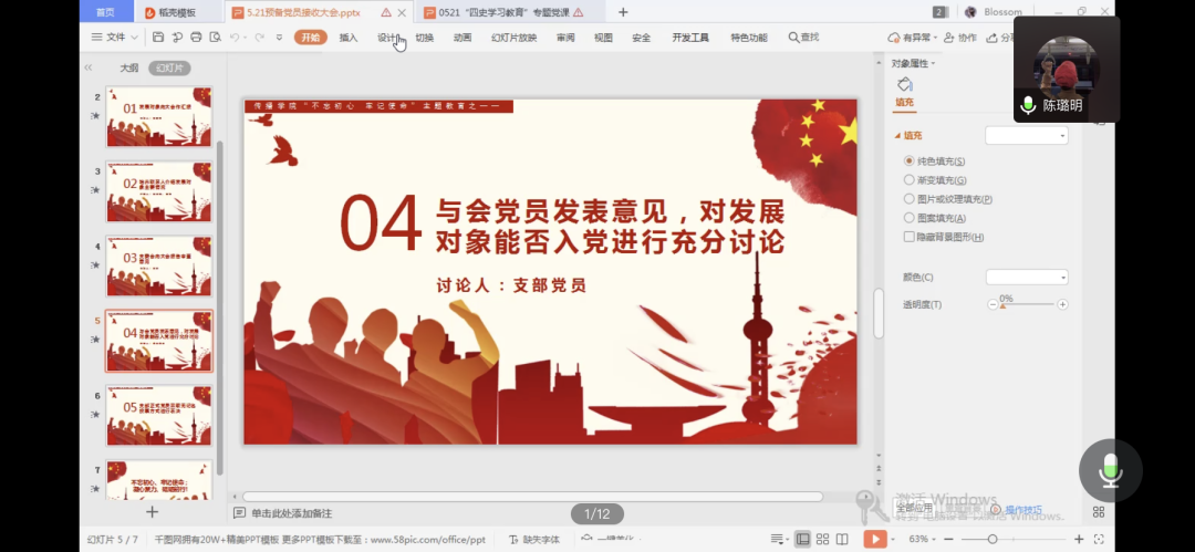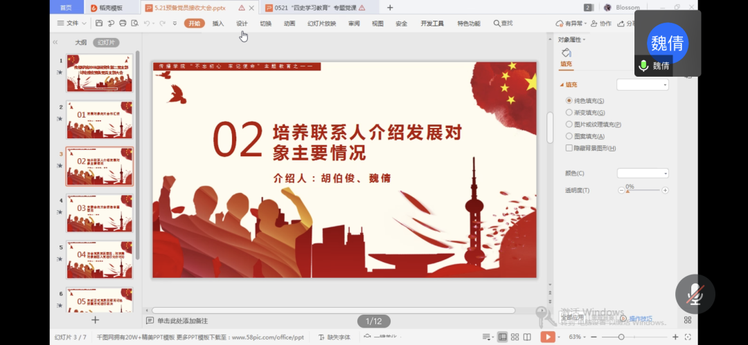 接下来,由谭若诗同志的培养联系人胡伯俊、魏倩同志依次对发展对象的现实表现和培养考察情况作了介绍,肯定了其优秀表现,也对其提出了今后应该注意加强与其他党员和群众的联系的建议与期望,最后对其能否入党、本人是否同意其加入党组织表示肯定。