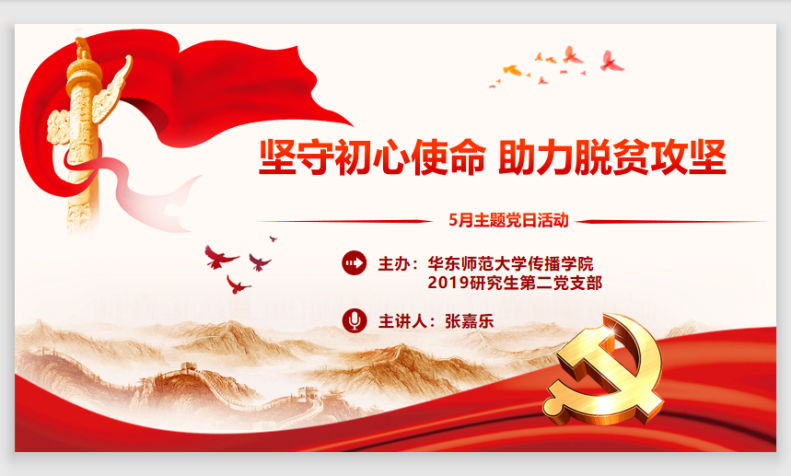 2020年5月27日下午3点,啪啪啦 2019级研究生党支部五月主题党日活动于线上召开。此次活动旨在通过回顾党史、学习党员先锋在脱贫攻坚中的模范事迹提升党员理论素养,坚定大家坚守初心使命、拼搏奋勇向前的信念。活动包括党史回顾、脱贫攻坚座谈会重要讲话学习、党员扶贫先锋事例、我校扶贫结对帮扶情况、把美好祝愿写给未来五个部分。此次会议由第二党支部张嘉乐同学主持。