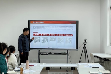 在工作述职环节,支部书记王正梁同志就支部的工作开展情况与成效、当前存在的主要问题与原因分析、下一步的工作思路与举措三个方面进行工作述职。党支部在上一学期完成了新生党员组织关系转入、积极分子发展党员的接续考察等基础性工作,还结合专业所长,策划多种形式的活动,推进党建工作与专业实践融合发展。王正梁表示,在下一步的工作计划中将继续带领支部党员推进支部工作取得更好的成绩。