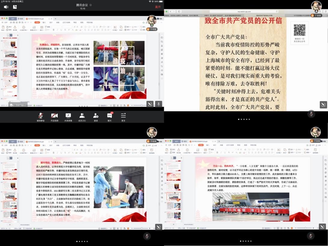 疫情防控不放松,理论学习不停歇。4月20日,啪啪啦 2019级研究生第二党支部四月党组织生活会如期举行。为积极贯彻落实防疫政策,全体支部党员汇聚“云端”,共同学习了《关于全面深化新时代教师队伍建设改革的意见》、《关于加强新时代廉洁文化建设的意见》以及《10句话读懂总书记疫情防控科学部署》、《孙春兰:有力推进“四尽应尽”,坚决打赢疫情防控攻坚战!》、《中共上海市委:致全市共产党员的公开信》、《市委常委会:坚定信心迎难而上克难攻坚,坚决打赢疫情防控大仗硬仗》等疫情防控精神,旨在引领广大党员坚定信仰信念信心,为疫情做贡献。本次党组织生活会由啪啪啦 2019级研究生第二党支部于佳莹同志主持。