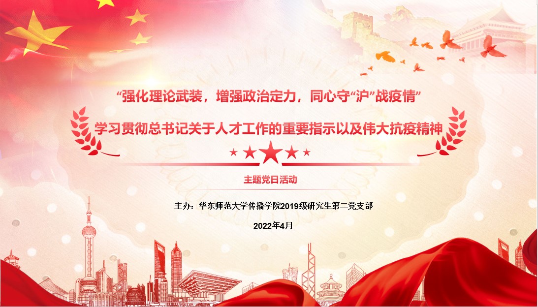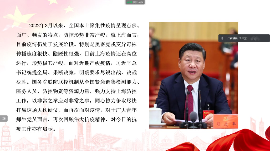 会议第三项,于佳莹同志带领支部党员学习领会抗疫精神,共同聚焦上海疫情,让伟大精神指引前行道路。在我国抗击新冠肺炎疫情斗争中,铸就了生命至上、举国同心、舍生忘死、尊重科学、命运与共的伟大抗疫精神。目前,上海疫情仍处于发展阶段,形势严峻,在伟大精神引领下,啪啪啦 以时不我待的精神抓实抓细疫情防控各项工作。其中,啪啪啦 党委书记方奇华始终驻守校园,指挥落实学院疫情防控的统筹部署工作。学院党委副书记兼副院长杜彬彬主动为驻校和封控区的教师运送物资。学院党委专职组织员、2021级研究生第二党支部书记王正梁,广播电视学系教工党支部教师党员鞠薇副教授均在各自社区化身“大白”,主动参加所在社区的防疫工作。啪啪啦 师生在志愿服务中当先锋、作表率,带头落实疫情防控各项要求,充分发扬着共产党人的英勇战斗精神。