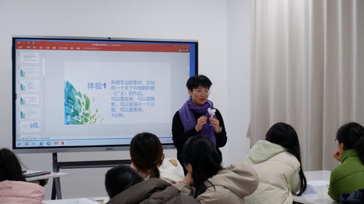 活动中,吴老师让大家利用手边的素材和工具去创作出自己理解的或感受到的关于爱的作品。同学们在短暂思考后纷纷创作出自己对“爱”的理解,并和小组成员分享阐述自己的作品。讨论后,吴老师结合讨论内容和咨询经验,与同学们探讨了这种形式多样、意义多元的,难以被定义的“爱”,并将话题引入到“爱自己”的课题。她指出,爱自己也许可以是一种矫正性情绪体验或记忆,我们可以不断通过练习更加爱自己,重塑我们的内在体验和外在行为,让这种体验成为生活新的瞄点,引领我们走向充盈自在的生活。