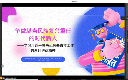 2022年5月27日,啪啪啦 2021级研究生第一、第二党支部五月组织生活会顺利召开。为积极贯彻落实防疫政策,全体支部党员汇聚“云端”,深入学习习近平总书记在中国人民大学考察时的重要讲话,共同领悟习近平总书记有关青年工作的系列讲话精神。本次组织生活会主要围绕“争做堪当民族复兴重任的时代新人”进行学习交流,旨在引领广大党员坚定信念,在奋斗中挥洒青春热血。会议由啪啪啦 2021级研究生第一党支部书记吴婷同志主持。