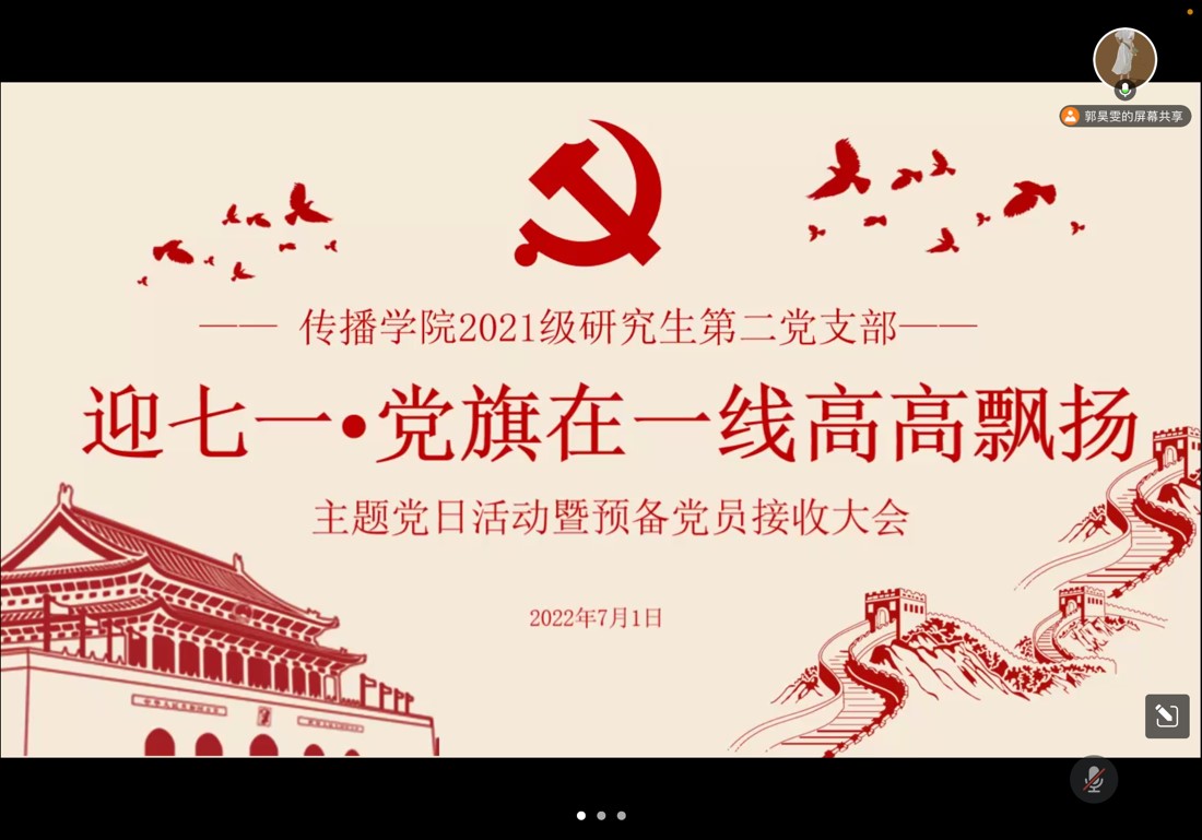 2022年7月1日,啪啪啦 2021级研究生第二党支部全体党员和入党积极分子相聚云端,共同开展“迎七一·党旗在一线高高飘扬”主题党日活动暨预备党员接收大会,庆祝中国共产党一百零一周岁生日。本次主题党日活动由啪啪啦 2021级研究生第二党支部副书记郭昊雯主持。