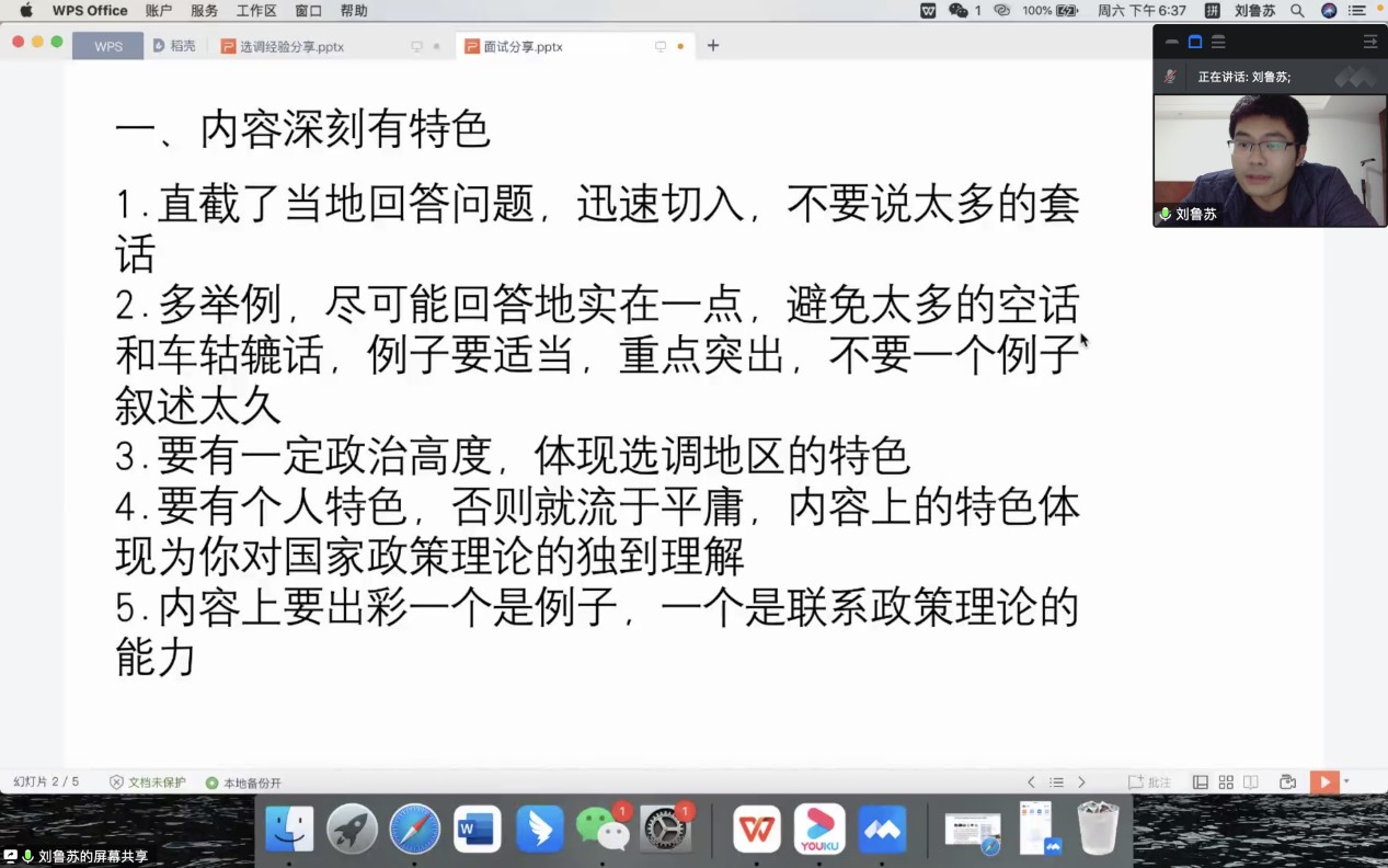 刘鲁苏学长主要聚焦选调生面试,从内容、表达、语言组织、心态四方面分享了一些自己的心得。