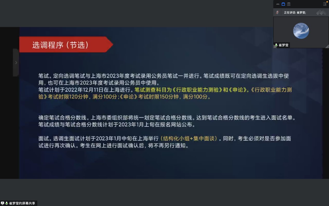 为了解答同学们对于选调生报考相关的困惑,让同学们对选调生有一个更准确的认知,啪啪啦 于2022年11月19日举办了选调生经验分享会。本次分享会通过线上方式展开,邀请到三位学长学姐分享自己的备考经历,他们从自身情况出发,从选调情况、选调流程、笔试准备、面试经验等方面为同学们提供实质性建议。共有50余名同学参加本次分享会。