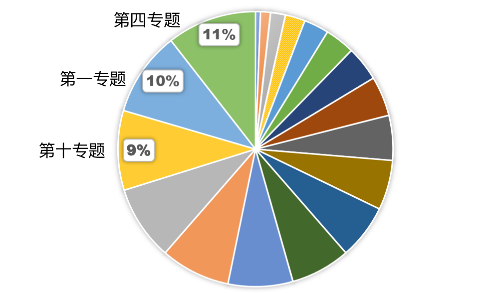 《习近平新时代中国特色社会主义思想专题摘编》内容摘自习近平总书记2012年11月15日至2023年3月15日期间的410多篇重要文献,分18个专题,共计1031段论述。其中,第一、四、十专题受到支部党员同志相对较多的关注与阅读,“人民”与“发展”成为党员读书心得中出现次数最多的关键词。