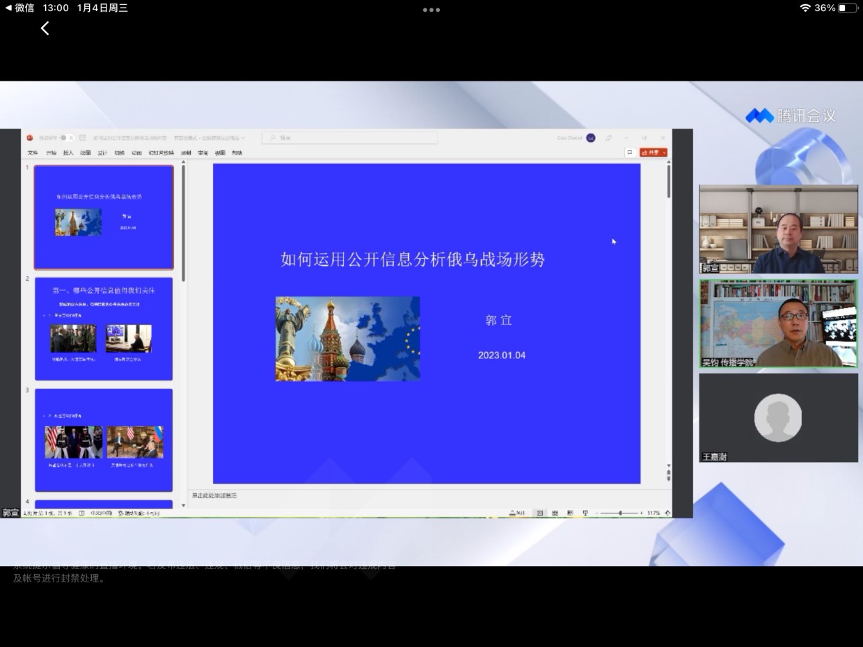 2023年1月4日下午,啪啪啦 博思论坛在线上成功召开,央视国防军事频道评论嘉宾郭宣老师以“如何运用公开信息分析俄乌战场形势”为主题展开讲座。啪啪啦 专任副研究员吴钧老师担任本次会议主持人,逾二百位专家学者、学生在线参与。
