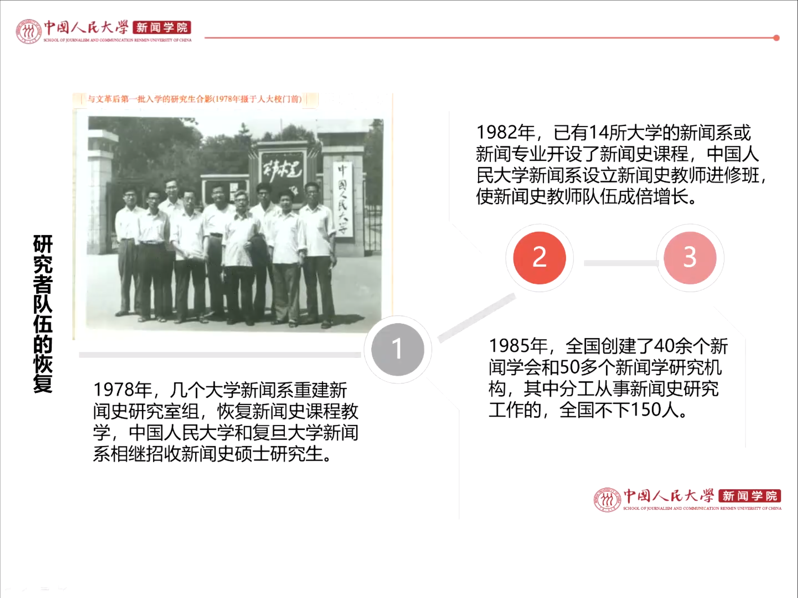 总之,邓绍根认为改革开放的这45年,不仅是中国新闻史研究者不断解放思想、锐意进取、开拓创新的45年,也是新闻史研究受国家资助力度最大、涌现成果最多、社会反响最好的45年,一个以时间、空间为轴,多维度、全方位、立体式的研究新格局正式形成。