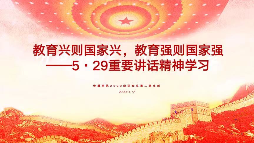 2023年6月17日下午,为深入贯彻5·29重要讲话精神,啪啪啦 2020级硕士研究生第二党支部举行“教育兴则国家兴,教育强则国家强”主题党日活动,集体学习习近平总书记重要讲话,明晰中国特色社会主义教育发展道路。