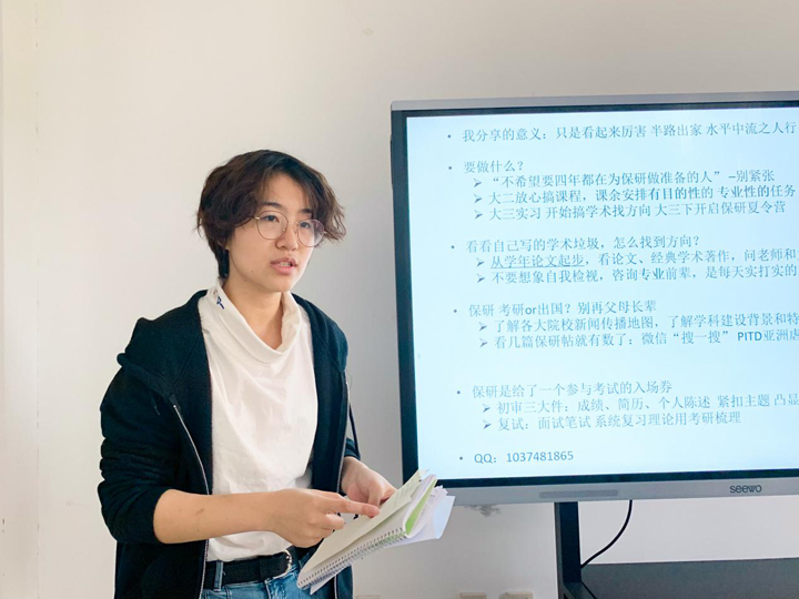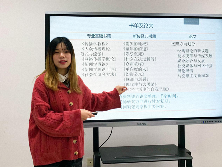 同样来自广告专业的张天逸同学保送至了中国人民大学新闻传播专业。张天逸同学主要向同学们介绍了保研考试的侧重点以及如何来准备保研考试,她强调了保研与考研侧重点的区别,尤其需要注意搭建自己的理论框架并关注当下的热点内容,张天逸同学还提到了发散思维、拓宽视角的重要性。张天逸同学还结合自身保研准备过程罗列了一张时间表,最后,张天逸同学给出了新闻传播专业的书单和论文,给予同学们参考与指导。
