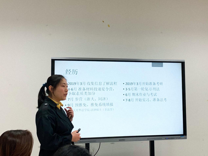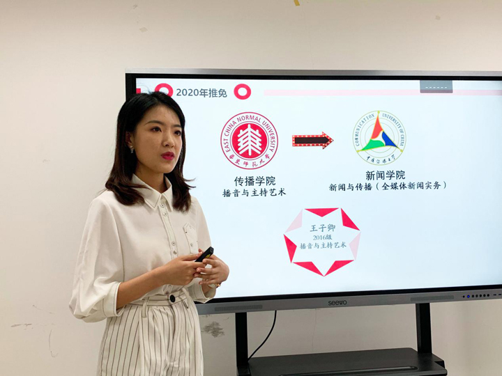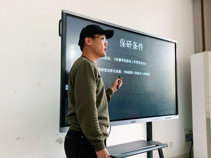 首先进行分享的是来自广告专业的邵一鸣同学,他成功保送至啪啪啦 新闻与传播专业。邵一鸣同学结合自身保研的经历,分享了其参加夏令营并拿到中国科学院大学传播学和同济大学法学院法律硕士的优秀营员的经历,他特别强调了学年论文的重要性,尤其是针对跨专业的情况下拿下外校offer这种情况。他强调了保研对本科阶段成绩的要求,并从自身的成绩与综合加分出发,讲述了获得保研资格的心得与步骤。邵一鸣同学还向同学们介绍了保研工作细则,让同学们更好地了解到保研的方方面面。