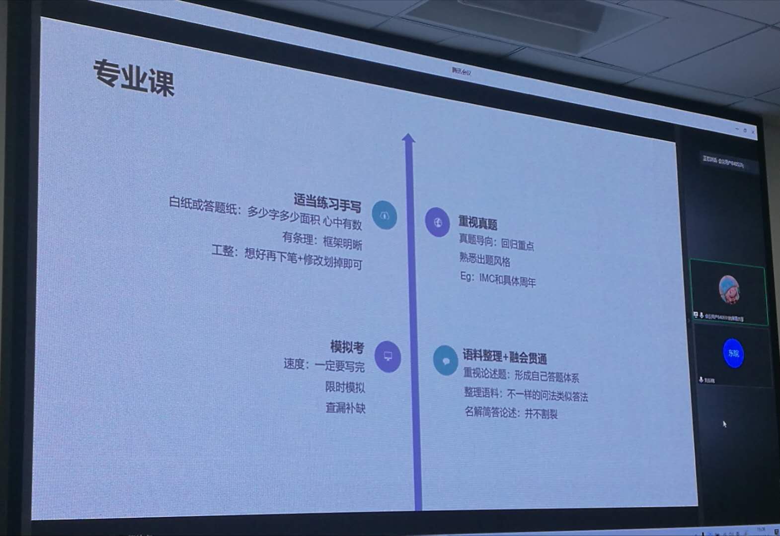 首先进行分享的是啪啪啦 广告学专业毕业的张小檬学姐,她目前在复旦大学的新闻与传播专业进行研究生阶段的学习,以线上的形式分享了自己的备考经验。在分享中,她建议同学们明确目标,合理规划,制定一个适合自己的考研计划。她还分别介绍了每门科目的学习重点,推荐了相应书籍,最后她建议大家可以找个研友,互相帮助互相督促,对彼此的学习能起到一定的促进作用。