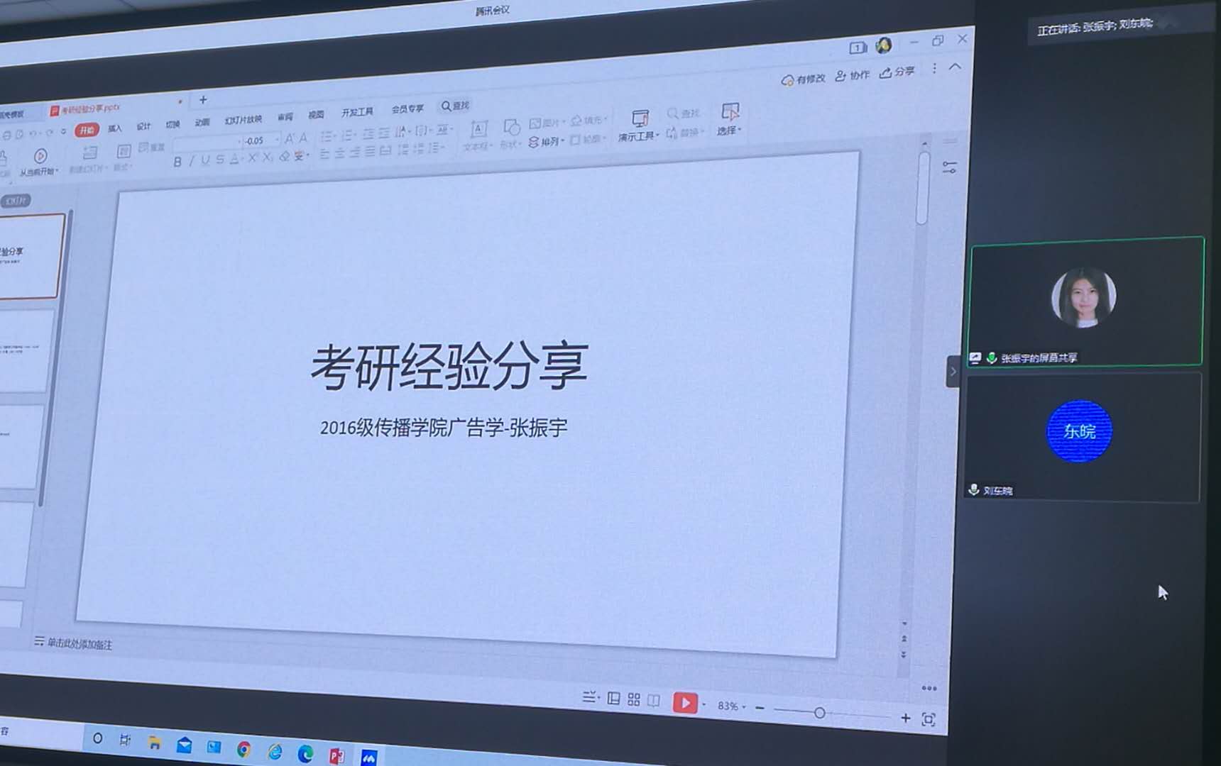 最后进行分享的是从啪啪啦 广告学专业毕业的张振宇学姐,她通过考研,进入中国人民大学的电影学专业深造。由于远在北京,张振宇以线上分享的形式向同学们讲述了自己的考研经历。她建议学弟学妹们可以结合自己未来的职业规划来确定考研的目标,包括以后就业的方向、想要留在的城市等。在制定好计划后,要有条理的一步步去完成自己的目标,保持一个良好心态,坚持就是胜利。