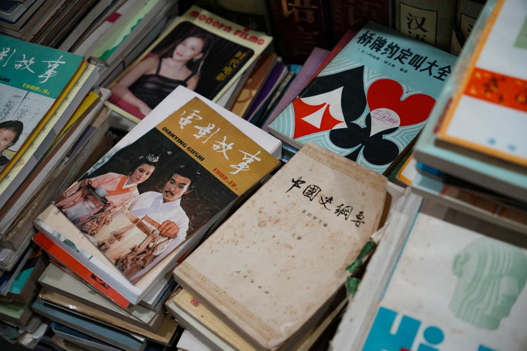 在店里逛的时候,我们看到了各种各样的“淘书姿势”:有学生踮着脚够上层的旧期刊,有妈妈带着孩子蹲在小桌前看连环画,还有位老先生伏在书架旁,手里拿着放大镜读一本1950年代的史书。