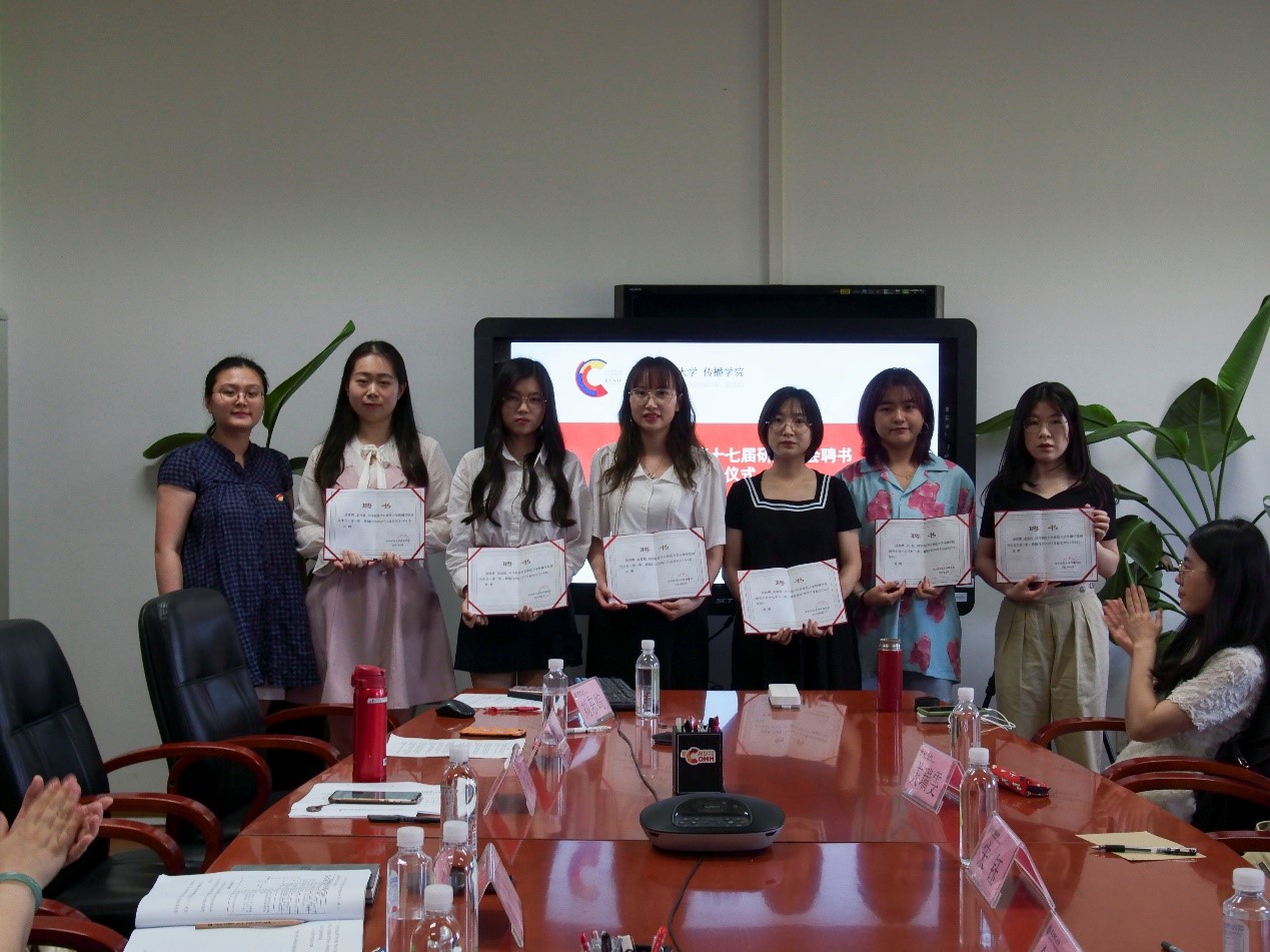 大会中,吴烨茜老师为啪啪啦 第十七届研究生会成员颁发聘书并合影留念