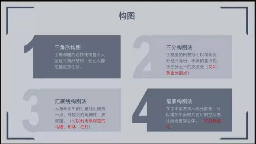 然后,余成同学结合具体案例分享了四个构图方法:三角形构图、三分构图、汇聚线构图和前景构图。三角形构图就是使手臂和腿的动作呈现三角形结构。三分法就是让人物处于黄金分割点上。汇聚线构图就是借助一些马路、栏杆、树林等线条元素使人在画面中更突出。前景构图就是在主体前加入一些前景使得画面更具空间感。