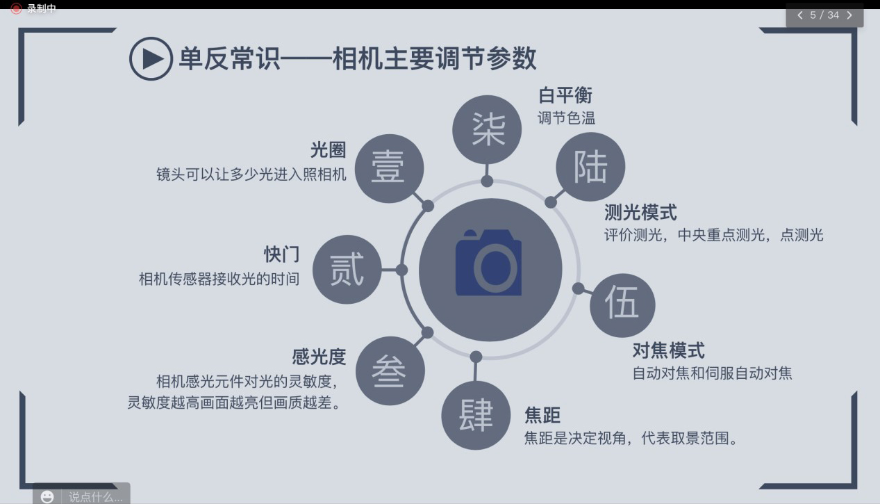 首先,在单反参数调节部分,余成同学重点介绍了相机主要调节的三要素:光圈、快门和感光度。除此之外,她还介绍了焦距、对焦模式和白平衡这三个重要参数。为了帮助大家更好地去理解这些参数,余成同学分析了几张图片的光圈使用和快门速度,并提示大家在光线较弱的时候,要开大光圈和高感光度,并且手持要稳。