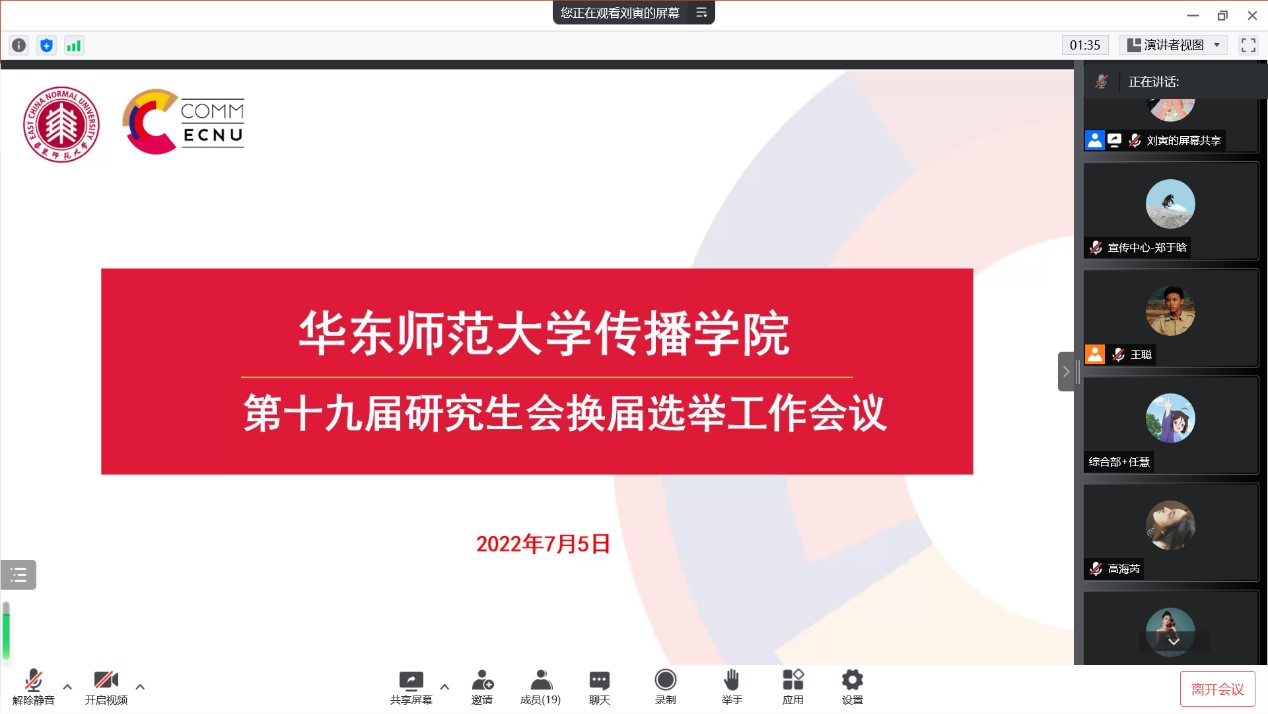 2022年7月5日上午10点,啪啪啦 第十九届研究生换届选举工作会议以线上形式召开,啪啪啦 团委书记吴烨茜老师、啪啪啦 第十八届研究生会全体成员及各班学生代表出席了本次会议。工作会议由啪啪啦 第十八届研究生会主席团成员王聪主持。