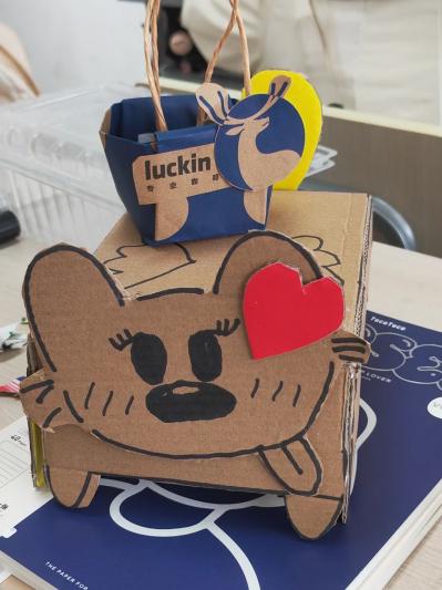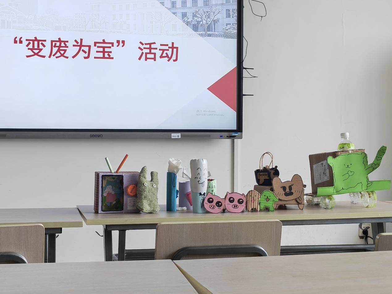 首先,团支书向团员们梳理了我国生态文明建设的相关政策,并播放了环保主题宣传片。随后,大家通过知识问答游戏形式巩固了四类垃圾分类的要领,更深入地理解了垃圾分类的意义。随后的“变废为宝”环节,团员们利用生活中的各种废旧物品作为原材料,充分发挥自己的想象能力和创造能力,进行DIY创作。大家提前收集了一些废品,如生活中常见的纸盒、矿泉水瓶、纸板、袜子等。在这个环节,这些废品经过各小组创造性地裁剪拼贴、彩纸包装、彩笔描绘后,变成了小狗玩偶、能换台的小电视、笔筒等装饰性用品。最后,大家依次展示了小组作品并为自己喜爱的作品投票。