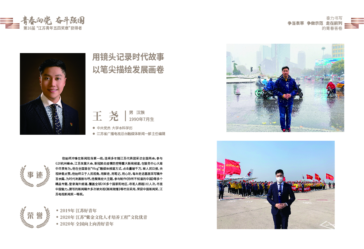 4月30日,共青团江苏省委公布了“第16届江苏青年五四奖章”入选名单,我院播音主持艺术专业09级校友、江苏省广播电视总台融媒体啪啪啦主任编辑、记者王尧继去年五四青年节被共青团中央授予“全国爱岗敬业好青年”光荣称号后再度入选2021年度“江苏青年五四奖章”。
