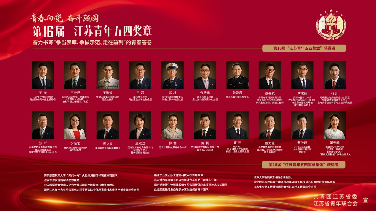 为集中展现新时代江苏青年紧跟党走、矢志奋斗的精神风貌,今年3月份,共青团江苏省委、江苏省青年联合会启动了第16届“江苏青年五四奖章”评选工作,经各系统、单位推荐和个人自荐,通过资格初审、综合复审、专家评审,并报经团省委书记室审定,最终确定第16届“江苏青年五四奖章”入选名单,其中个人20名、集体11个。