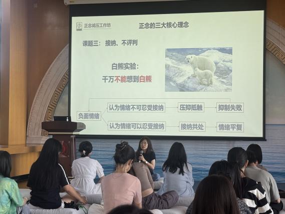 吴冉老师先给同学们讲述了正念的三大核心理念,接着给大家介绍了正念冥想的作用效果。正念冥想的练习可以帮助人全然打开对自己的觉察,最终能帮助人达到一种对自己的全然的接纳。
