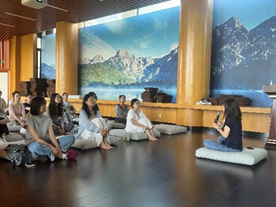 冥想进行时,同学们闭上双眼,跟随着吴冉老师于深呼吸间觅得平衡悠然,让疲惫的心寻安宁以抚慰,共同奔赴一场冥想之旅。