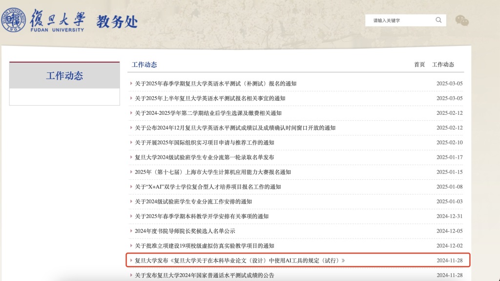 2024年11月,《复旦大学关于在本科毕业论文(设计)中使用AI工具的规定(试行)》发布。 复旦大学教务处官网 图