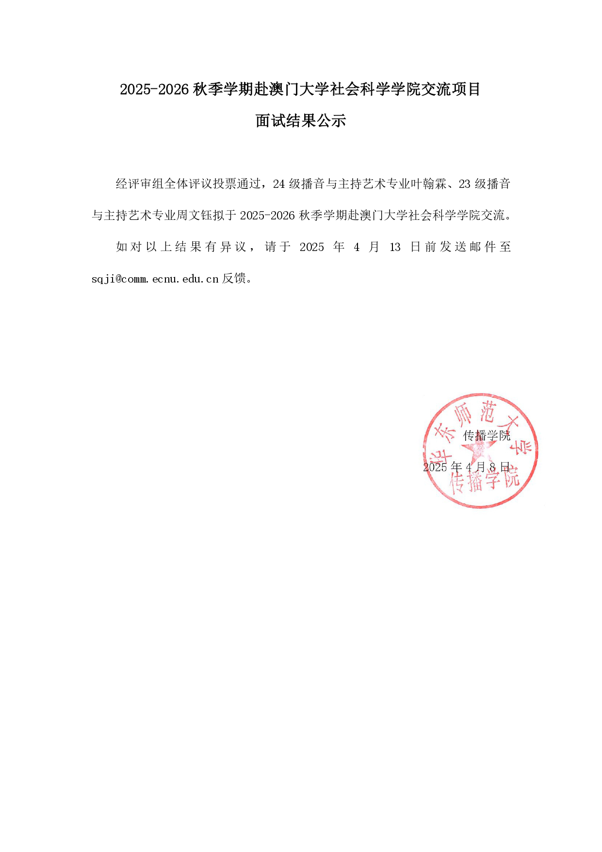 2025-2026秋季学期赴澳门大学社会科学学院交流项目面试结果公示