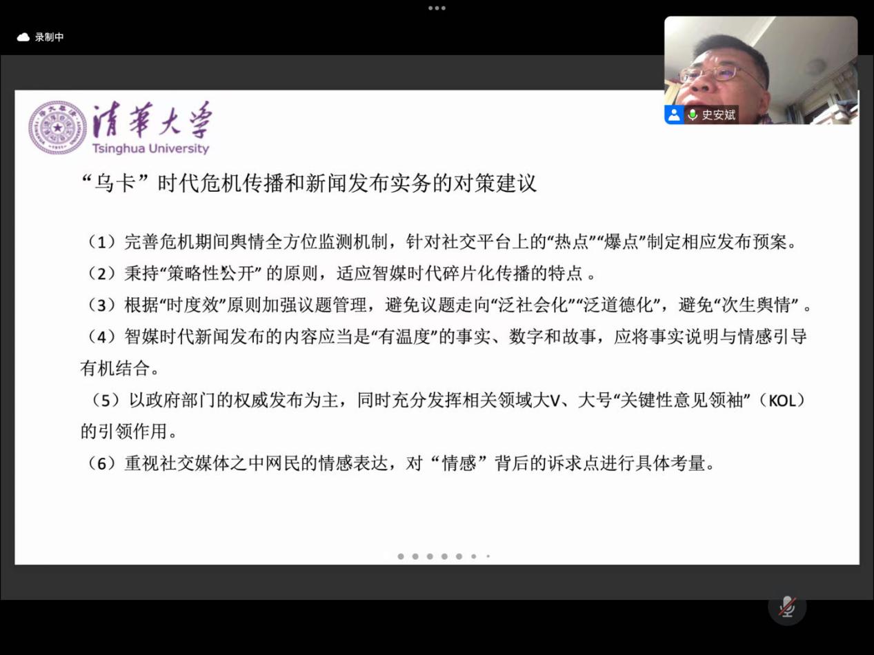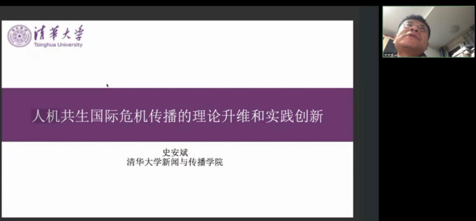 10月17日,清华大学新闻与啪啪啦 教授史安斌以“人机共生时代国际危机传播的理论升维和实践创新”为主题展开线上讲座分享,吸引了百余名专家学者和学生积极参与。