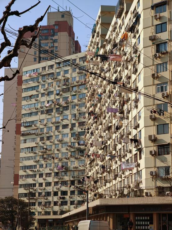 时间来到70、80年代,上海最早一批高层住宅开始建设,这种晾衣杆也被沿用下来,从远处望过去,高楼搭配龙门架,颇具“怪兽大厦”的风范。