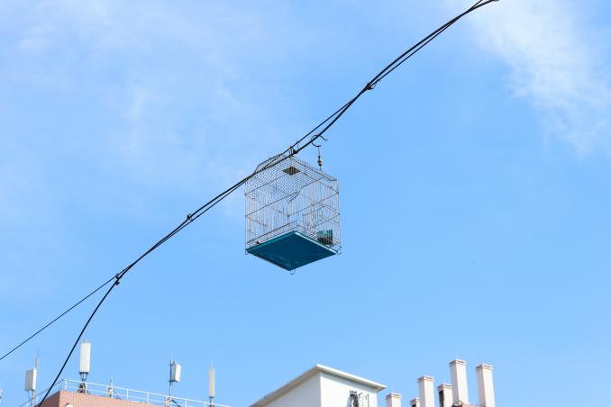 上海大爷将鸟笼挂在电线上(存在安全隐患,请勿模仿)