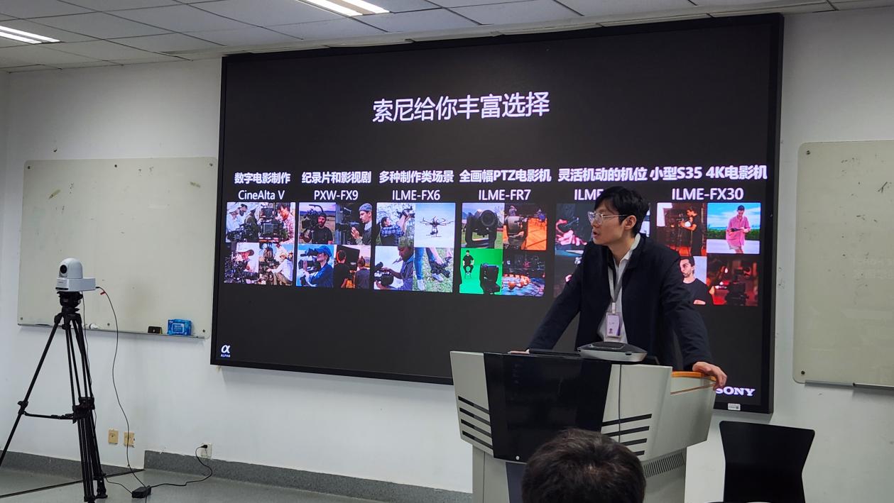 首先,来自索尼中国的专业讲师金老师为学生们带来了“索尼电影创作坊”主题分享课程,为热爱电影创作的同学们提供学习交流机会。通过观看罗博哈迪、赵小丁以及杜杰等著名电影制片人了解了索尼电影机型号及其在电影创作中的独特优势,金老师与同学们分享在电影制作领域的丰富经验和专业知识。并且详细介绍索尼电影机型号,包括各种型号的特点、性能优势以及在不同创作场景下的应用,同学们亲身体验先进的电影制作设备,感受高质量的电影创作设备。