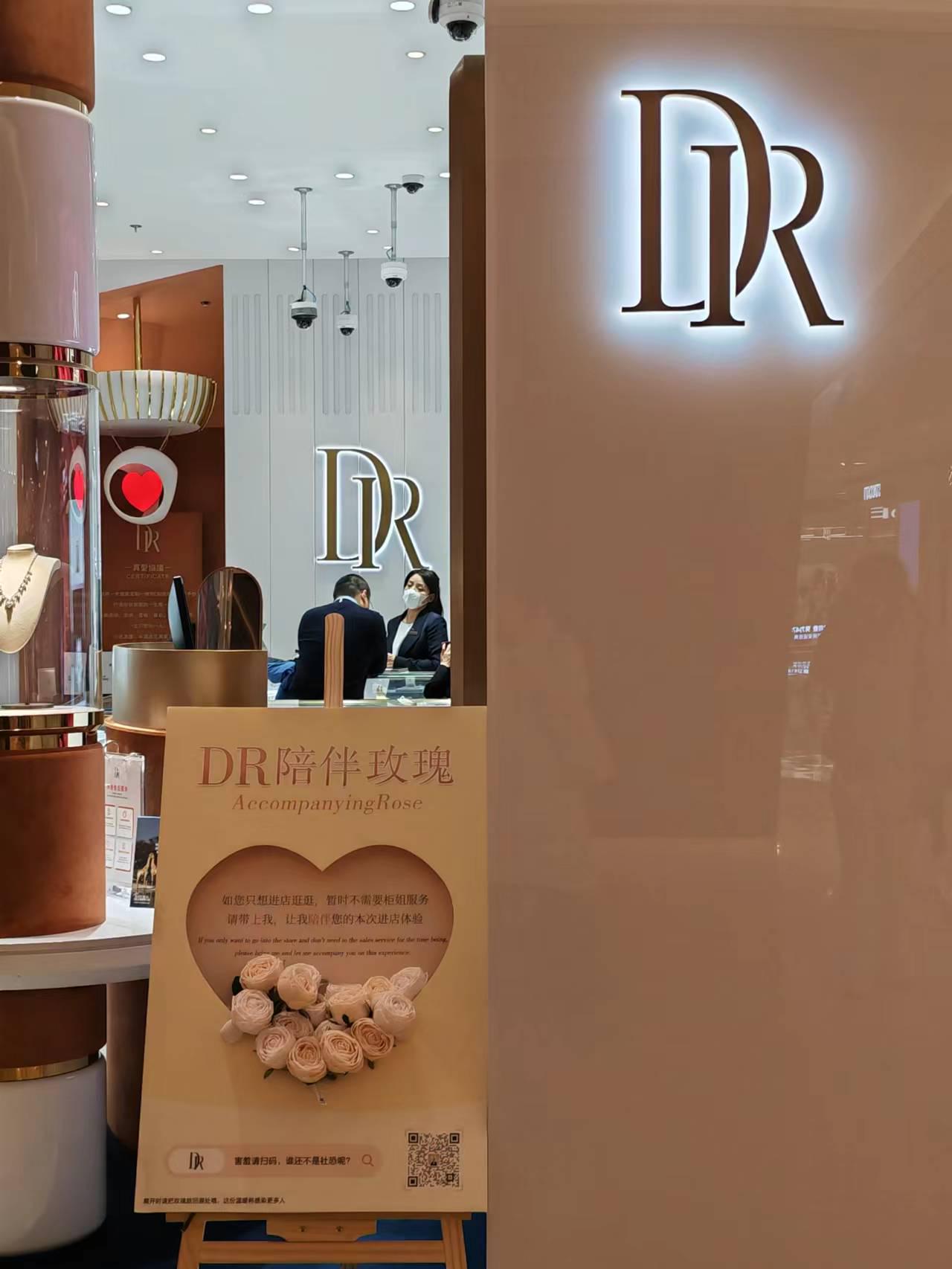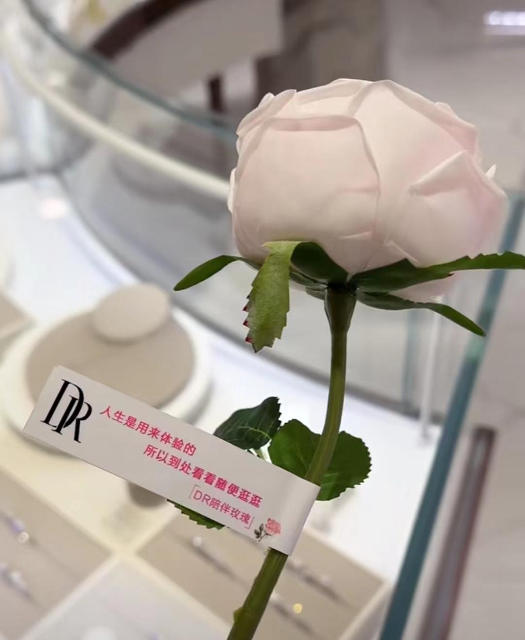 一支浅粉色的玫瑰,是“i人”顾客与DR钻戒最默契的信号:我自己逛,不需要跟随、讲解。2023年10月28日,DR官方账户在多个平台上发布“听说这是i人最想要的门店服务”文章,正式推出“陪伴玫瑰”服务。该服务推出后,DR被许多网友慕名打卡。