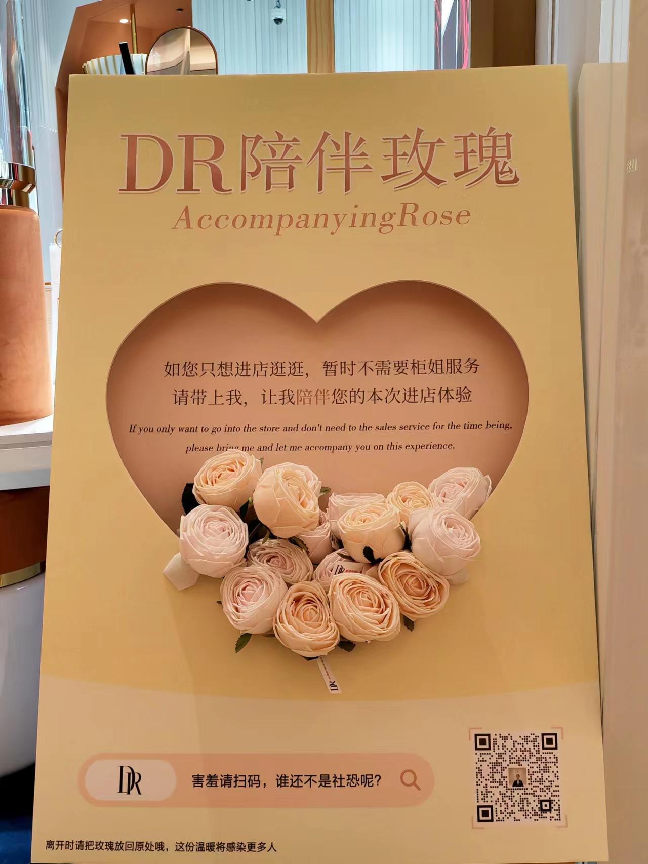 从店门口的立牌中小心地拿起一支浅粉色的玫瑰,沈静晗忐忑地走进店里——没有凑上来的导购。沈静晗松了口气,默默攥紧了那朵玫瑰,把它放在胸前显眼的地方,开启自己的购物之旅。这是DR钻戒推出“陪伴玫瑰”服务后经常出现的一幕,DR也因此被许多网友赞为“i人天堂”。