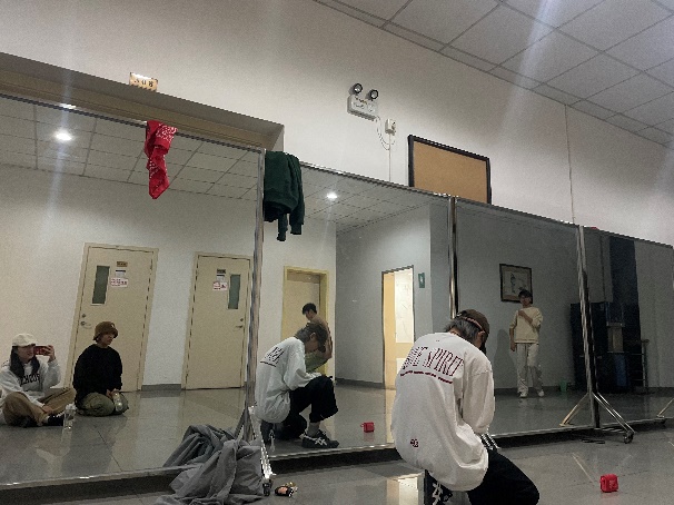 镜影舞社的舞室在大学生活动中心303,这个房间很大:长15米,宽8米;但实际上可供舞社跳舞的地方不到50平米——这个房间被瓜分了——八个靠墙的大架子,很多堆在一起的大纸箱和辨不清是什么的杂物占满了房间的四角,甚至在进门右手侧还有一整套的架子鼓。这就是共有265个成员的镜影舞社的舞室,一个看起来更像杂物间的舞室。舞社成员们在里面跳舞的时候,彼此之间的距离甚至不足20厘米。