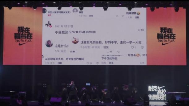 FDanso舞社在耐街上的舞蹈,背后大屏上是部分评论截图