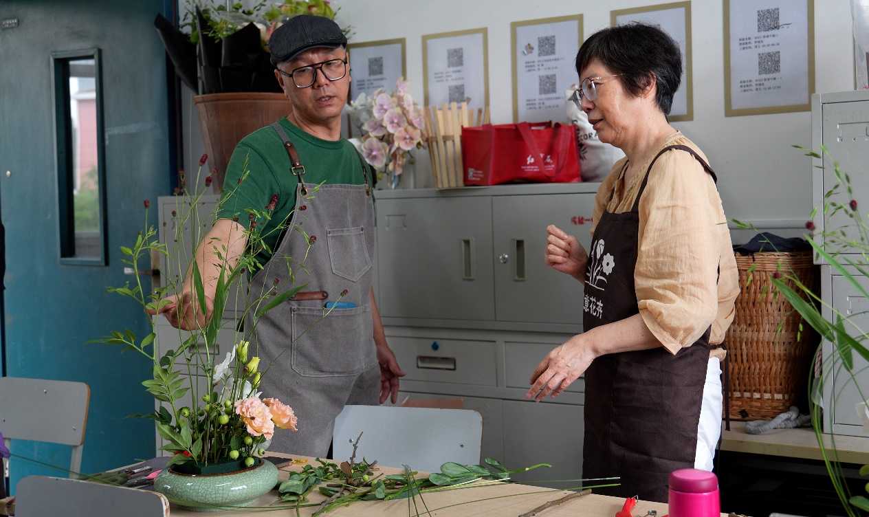 课后,在朋友圈、小红书等社交平台,看到学员的作品,带着自豪的文案,程融会一一点赞、评论。“让这些姐姐们找到一件有意义的事情,并且对我的插花教学感到满意,让我很有成就感。”