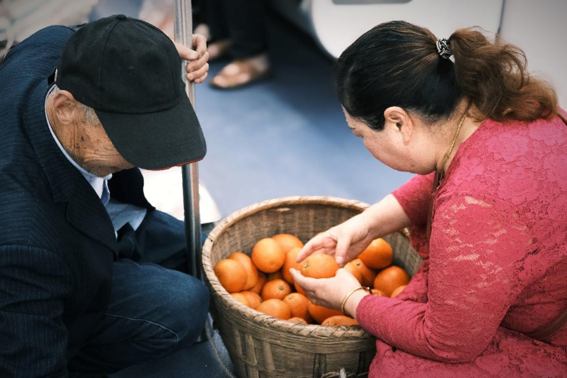 汇集了菜农与城市居民的地铁十号线,自然成为了他们进行蔬果交易的场所。正在挑选橘子的是住在江北区的王女士,作为一名家庭主妇,她每周六早上会乘坐这班地铁送小孩儿去上辅导班。王女士一边选橘子一边感慨:“每周六都有很多这些农民,你看他们背篓里啥都有,豆角、番茄、自家晒的干菜,下车前就能把菜买齐,省得绕去菜市场。”